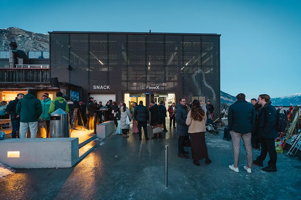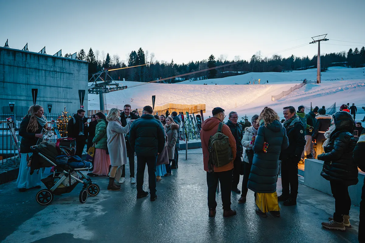Um 18 Uhr versammelte sich die 60-köpfige Hochzeitsgesellschaft an der Talstation Flims, und wir fuhren gemeinsam mit der Gondelbahn nach Startgels. Dort erwarteten J&F ihre Gäste auf der Terrasse – er im eleganten Hochzeitsanzug, sie im schicken weißen Skianzug.