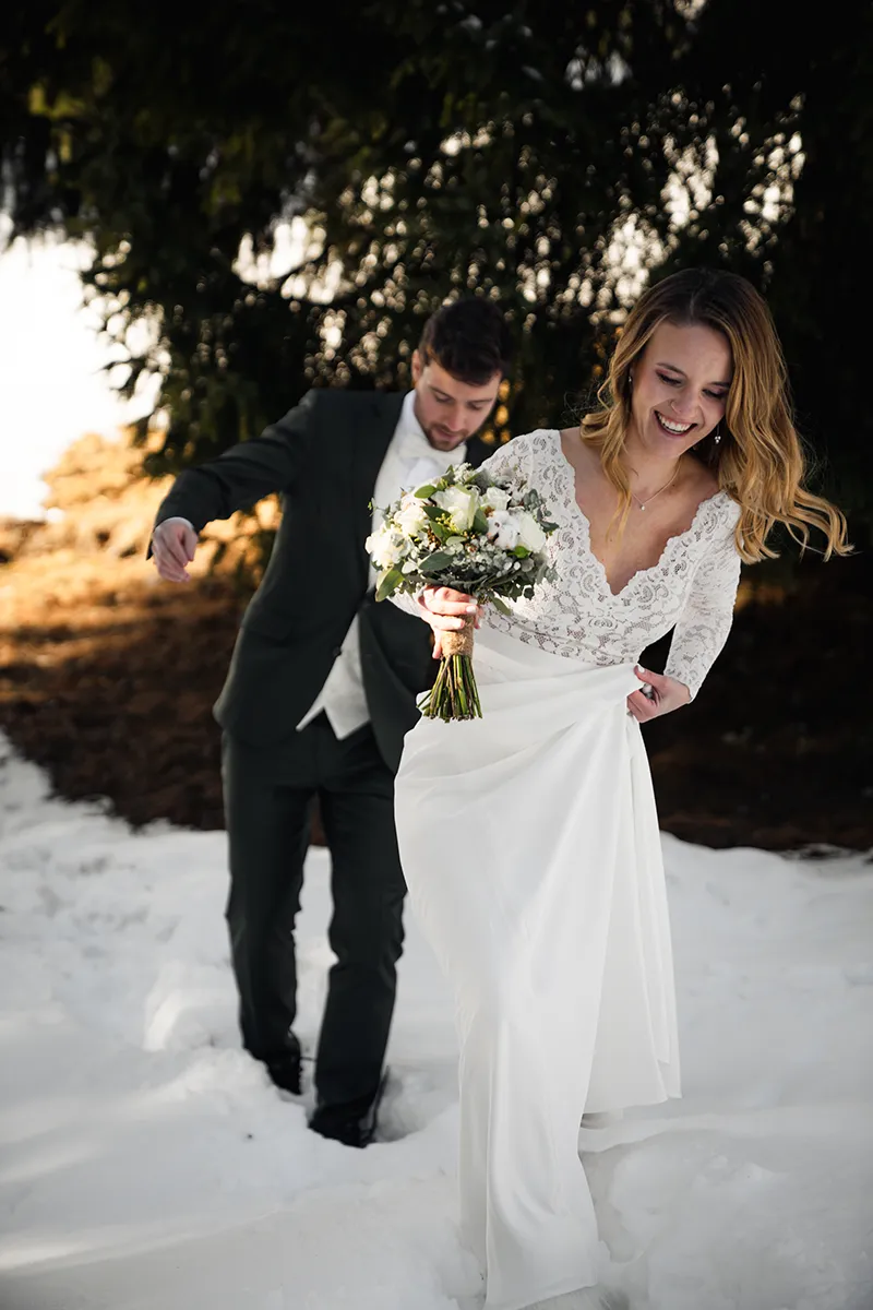 Am Tag vor der Hochzeit fuhr ich mit der Bahn nach Startgels, um die besten Spots zu erkunden und den Sonnenstand genau zu planen. Ich hatte J&F gefragt, ob es in Ordnung wäre, durch ca. 40 cm Schnee zu laufen – kein Problem, sie kamen mit guten Winterschuhen, die High Heels in der Tasche.