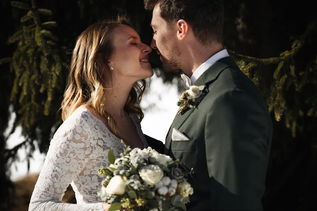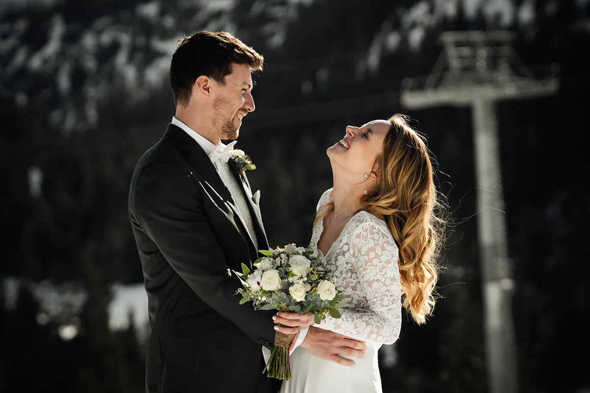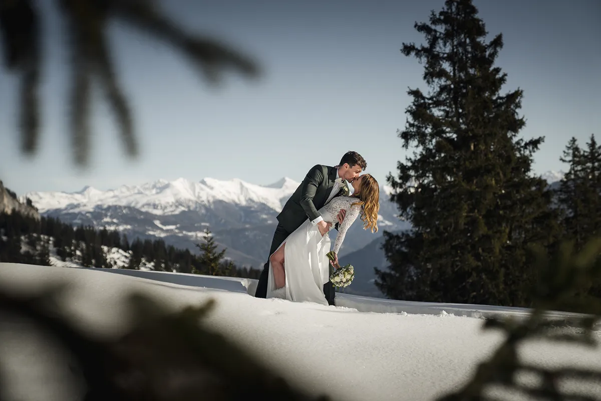 Das Skigebiet Flims Laax verwandelt sich im Winter in eine Bilderbuchkulisse. Tief verschneite Wälder, klare Bergluft und das besondere Licht der Alpensonne – dazu eine Gondelbahn-Anfahrt für die Gäste. Winterhochzeiten sind seltener als Sommerhochzeiten, was ihnen automatisch etwas Exklusives verleiht. Wichtig: gute Logistik, warme Kleidung für das Shooting – und am besten einen Tag früher die Locations scouten.