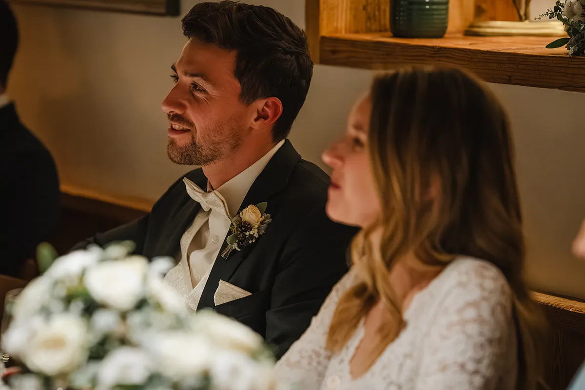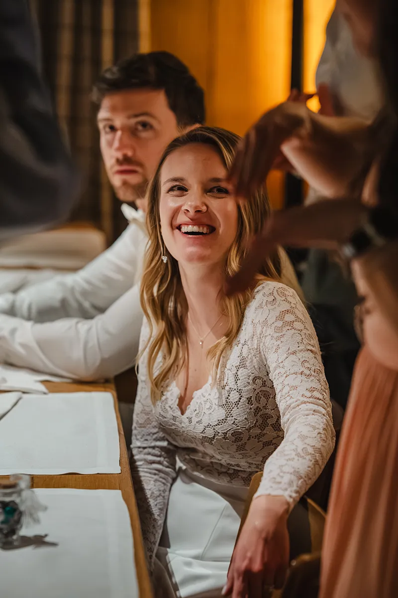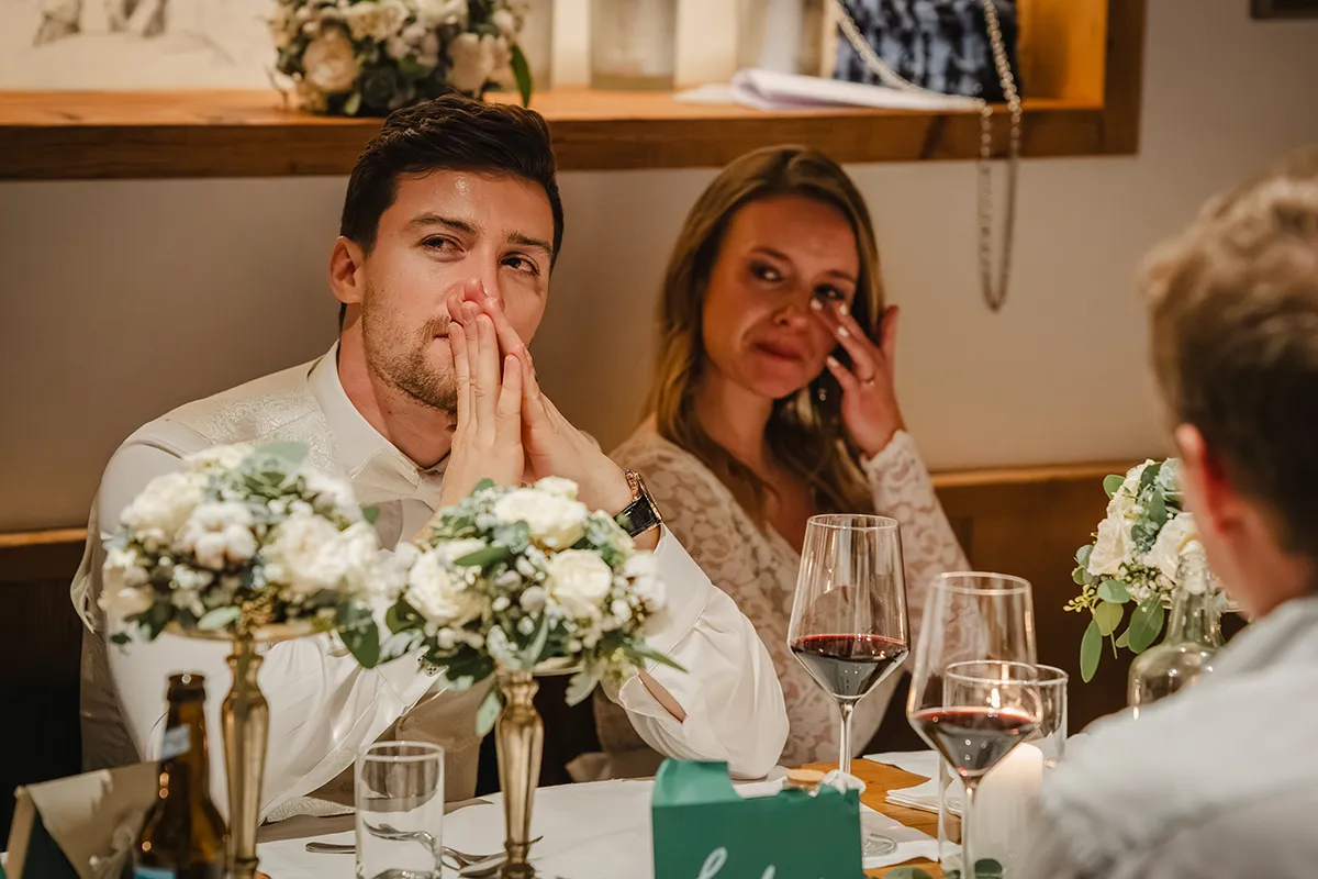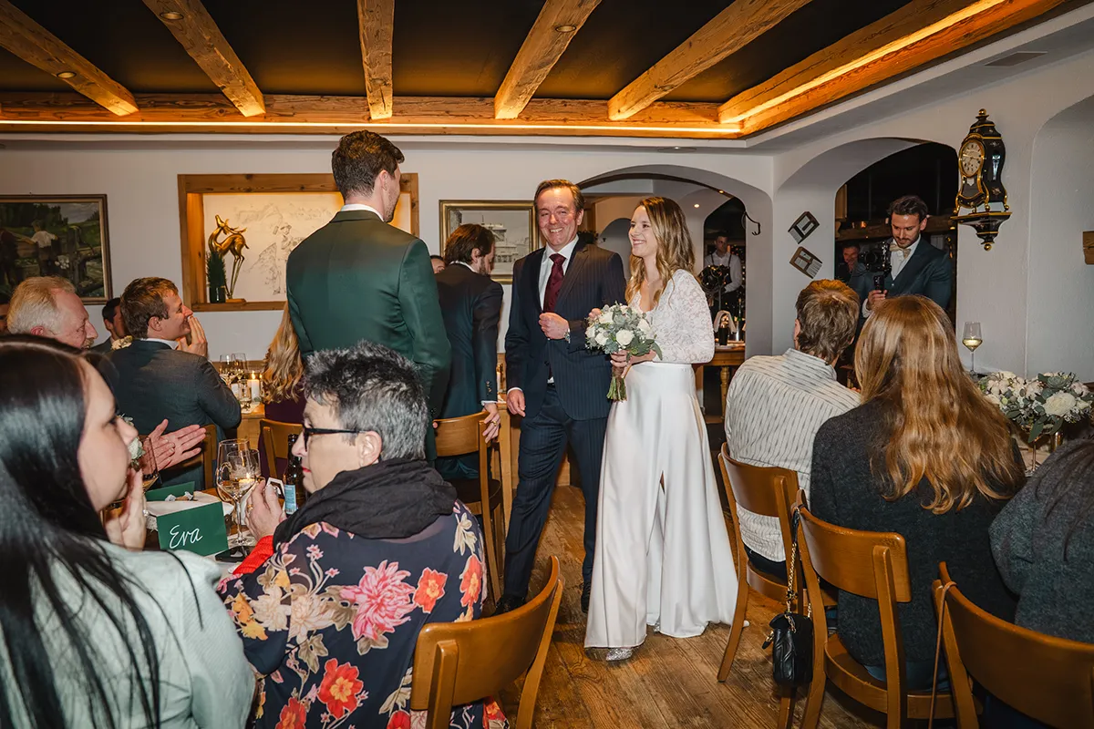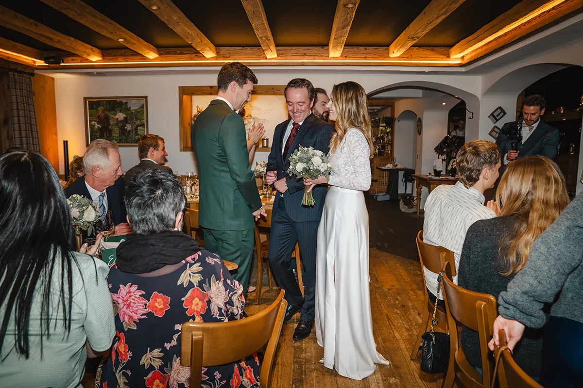 Drinnen wechselte die Braut ins Hochzeitskleid. Sie kam mit ihrem Vater rein – Applaus. Die Rede des Vaters war ergreifend; bei Braut und Bräutigam liefen die Tränen. Das Hochzeitsessen war kulinarisch ein Highlight, der Abend geprägt von herzlichen Beiträgen von Familie und Freunden.