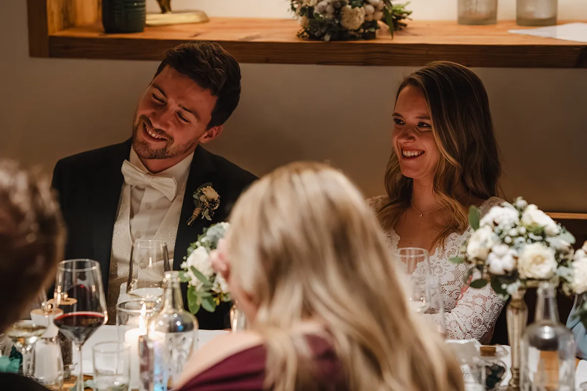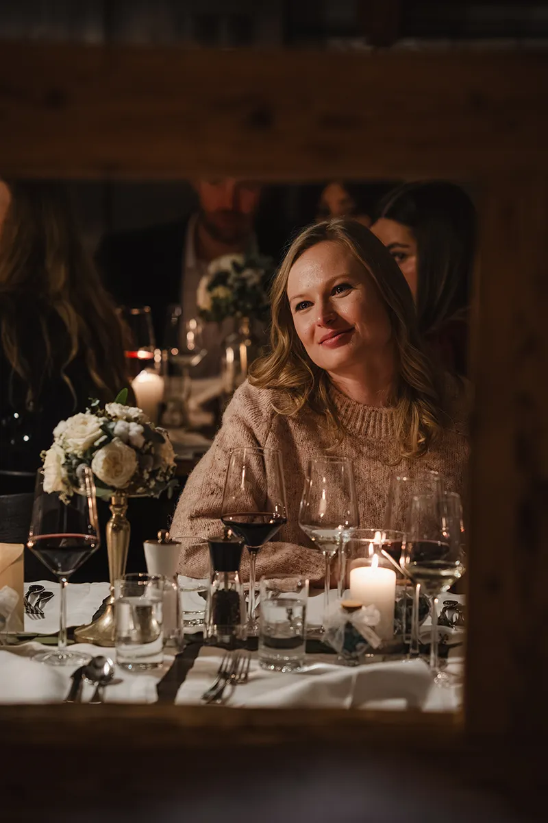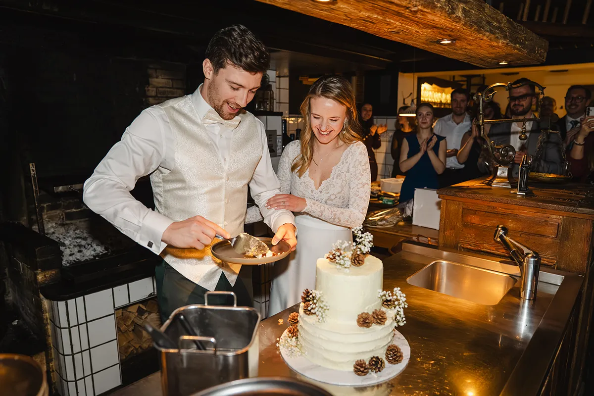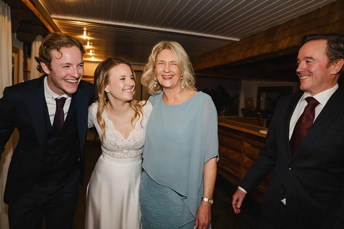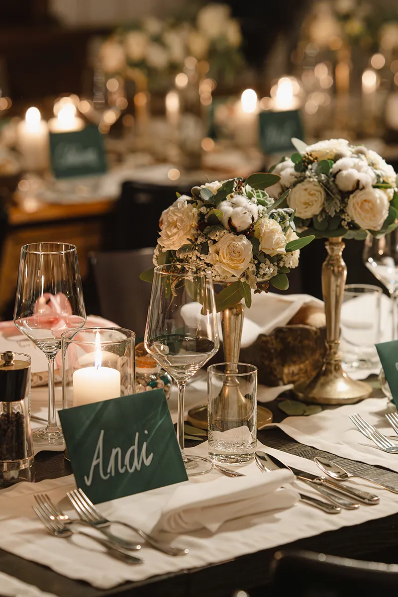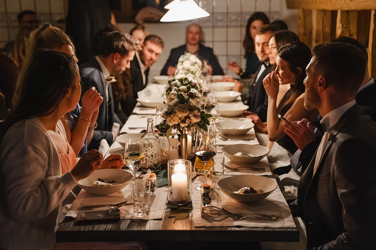 Drinnen wechselte die Braut ins Hochzeitskleid. Sie kam mit ihrem Vater rein – Applaus. Die Rede des Vaters war ergreifend; bei Braut und Bräutigam liefen die Tränen. Das Hochzeitsessen war kulinarisch ein Highlight, der Abend geprägt von herzlichen Beiträgen von Familie und Freunden.