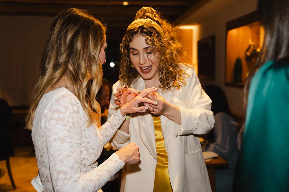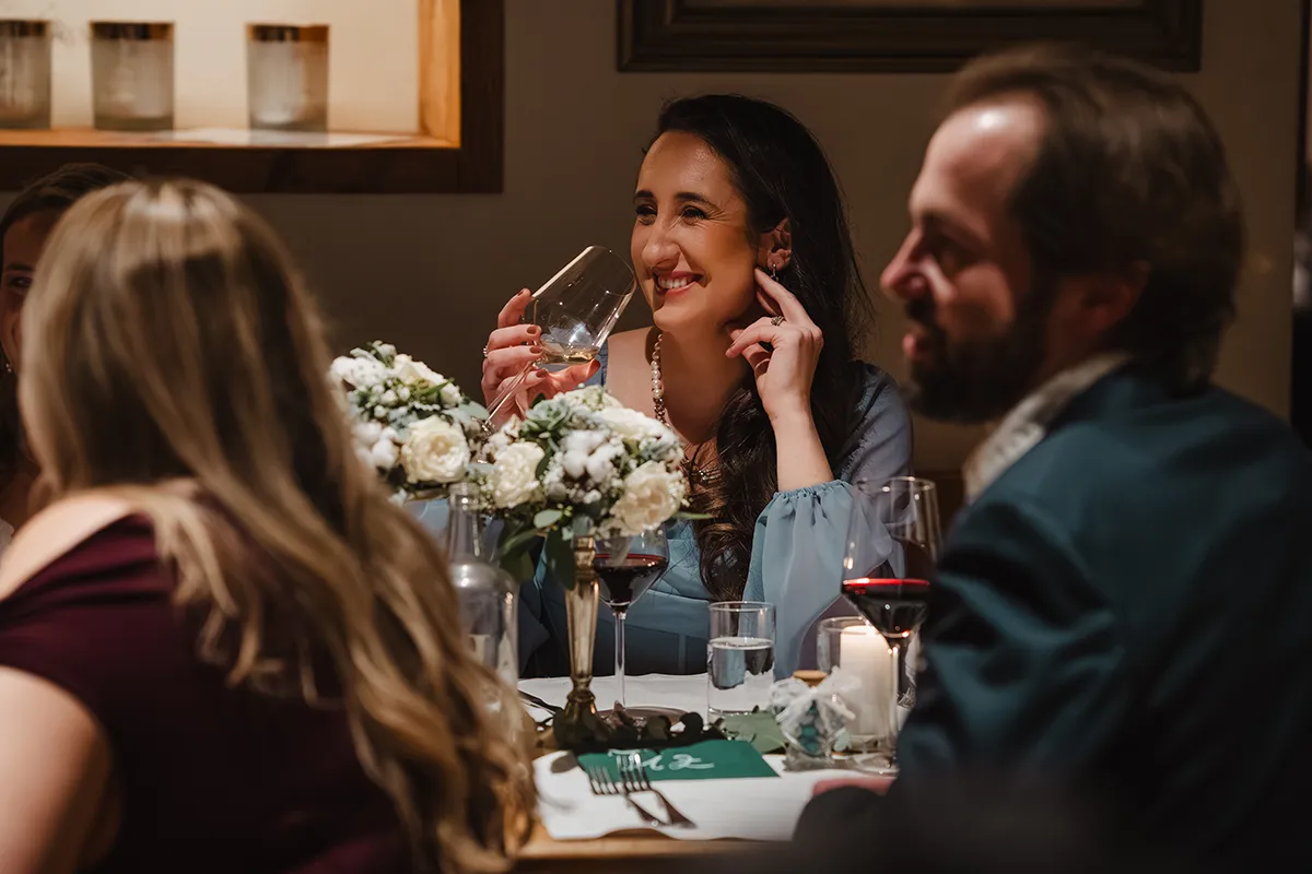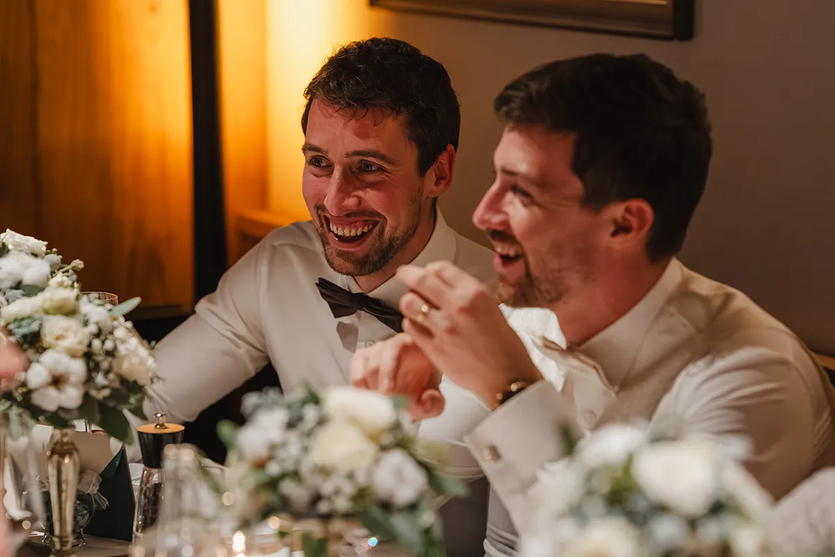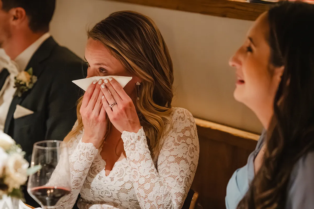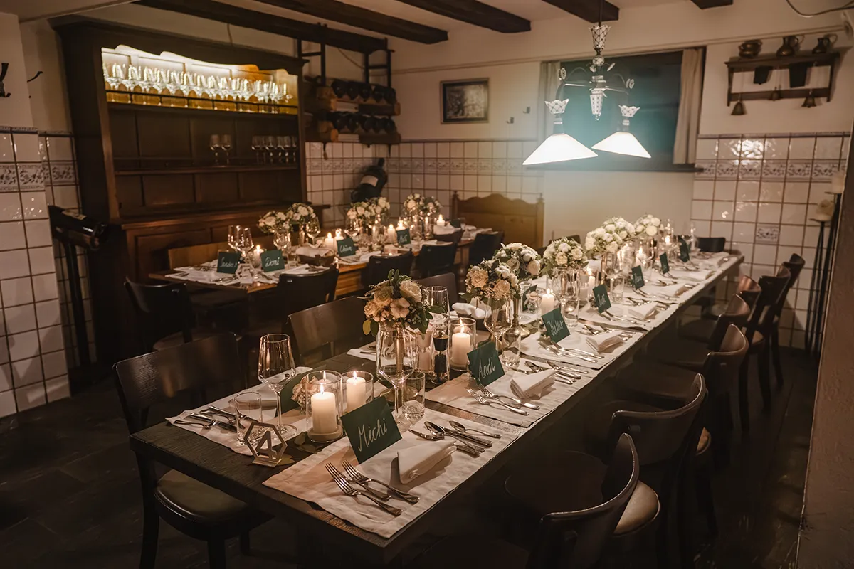 Drinnen wechselte die Braut ins Hochzeitskleid. Sie kam mit ihrem Vater rein – Applaus. Die Rede des Vaters war ergreifend; bei Braut und Bräutigam liefen die Tränen. Das Hochzeitsessen war kulinarisch ein Highlight, der Abend geprägt von herzlichen Beiträgen von Familie und Freunden.