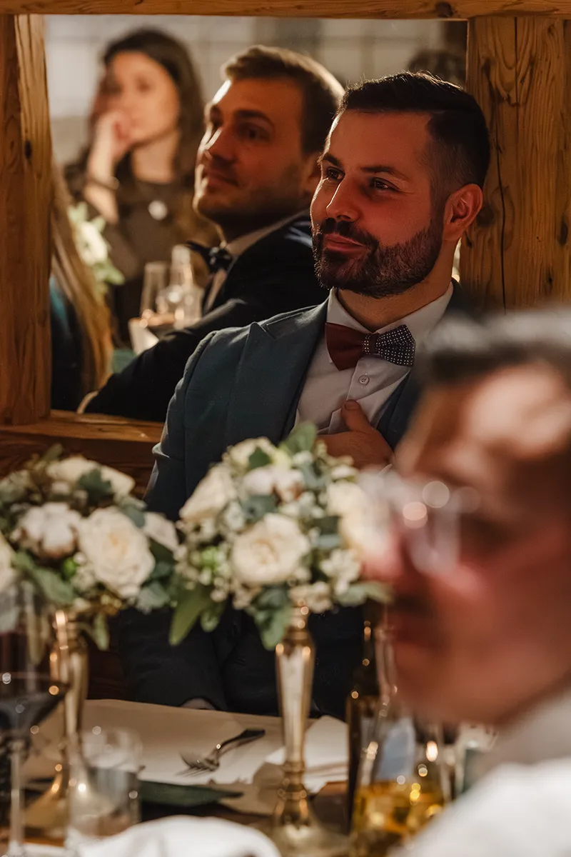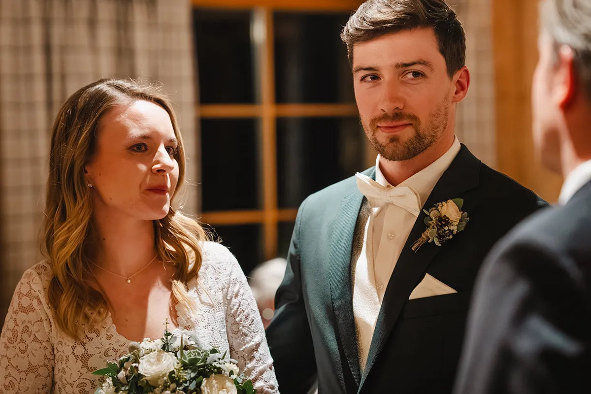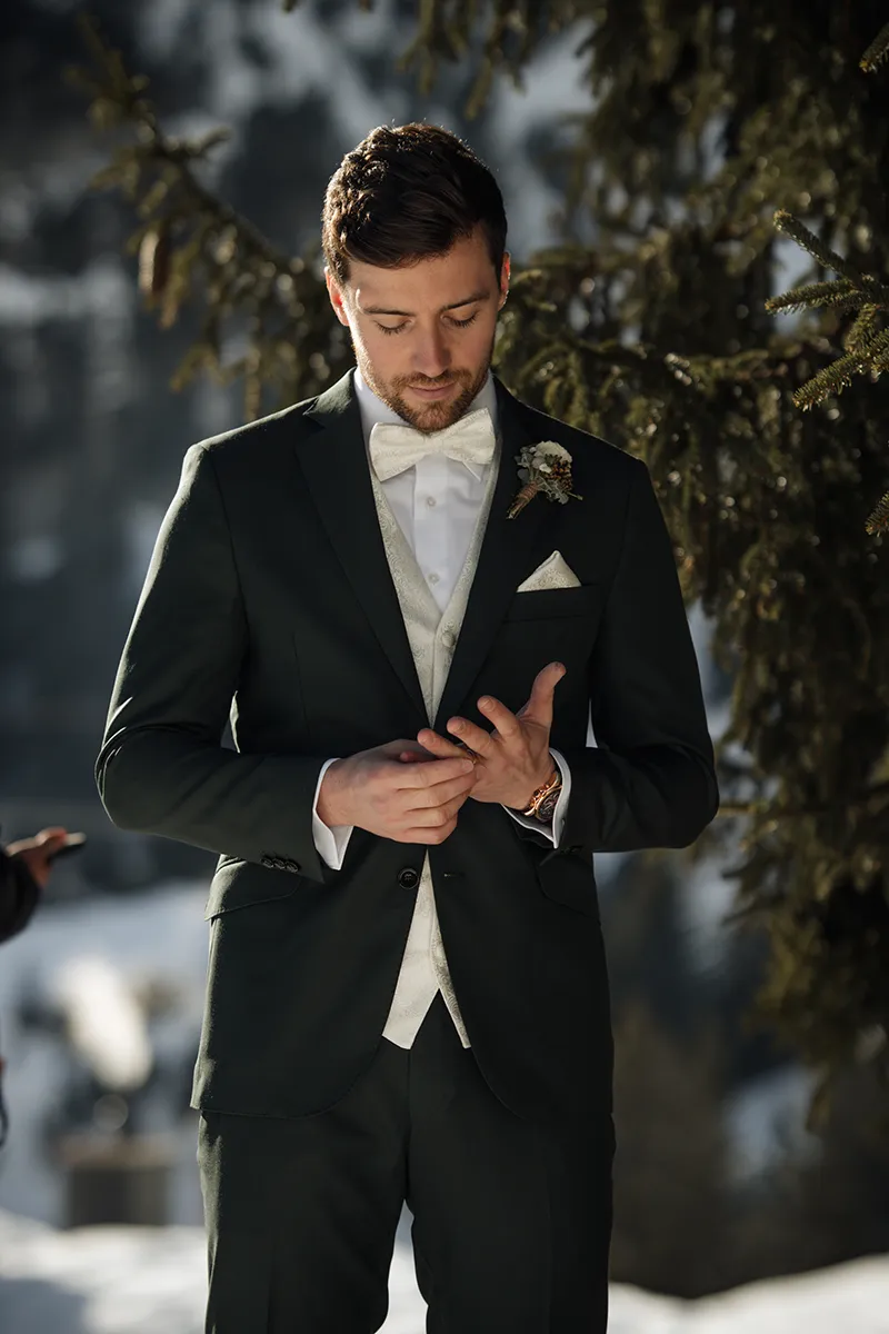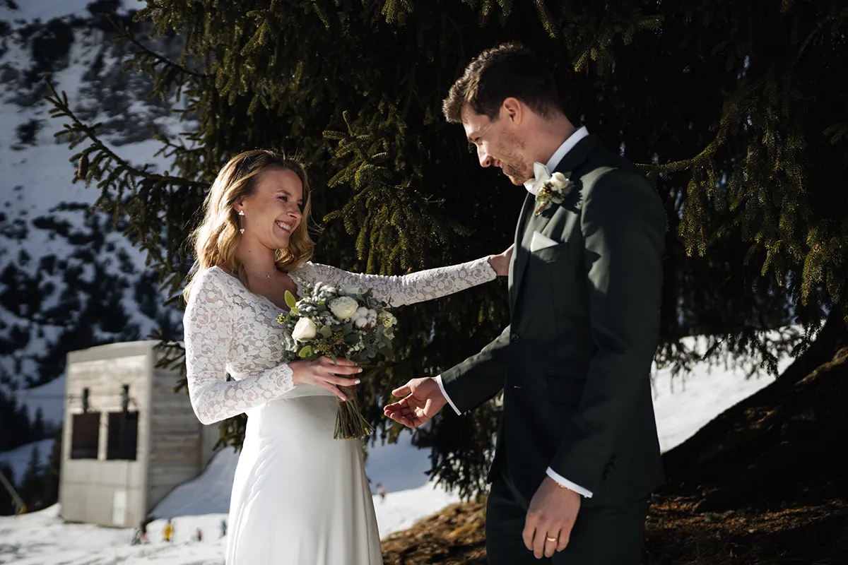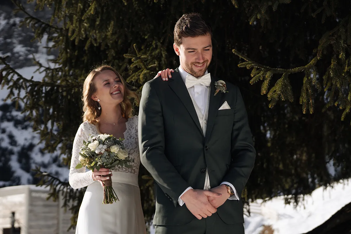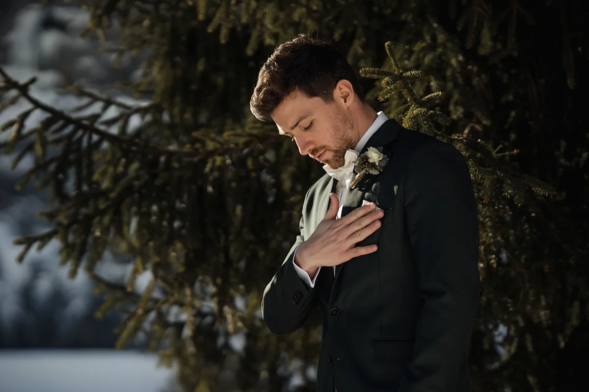 Um 14 Uhr stand ich mit dem Bräutigam und seinem Best Man bei einer schönen Tanne und wartete auf die Braut. Er war sichtlich aufgeregt, in sich gekehrt – und berührte in Gedanken versunken seinen Ehering. Ein stiller, intimer Moment.