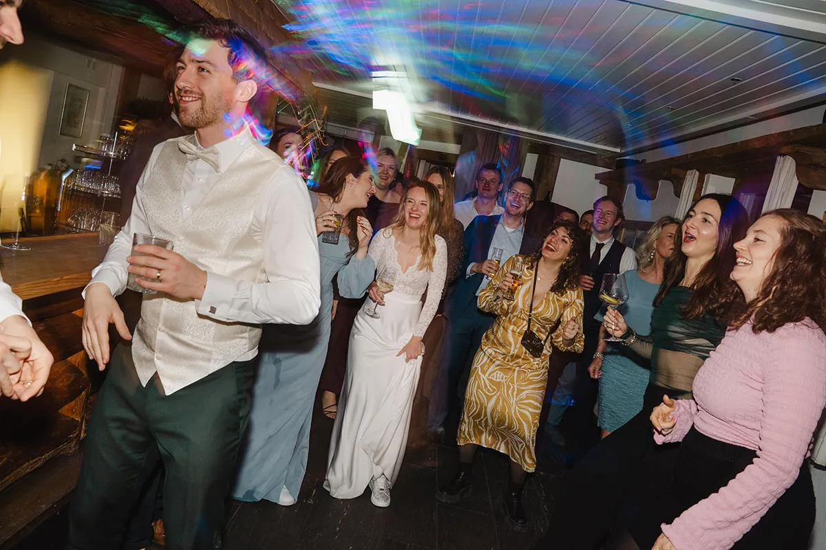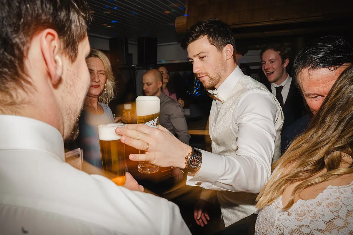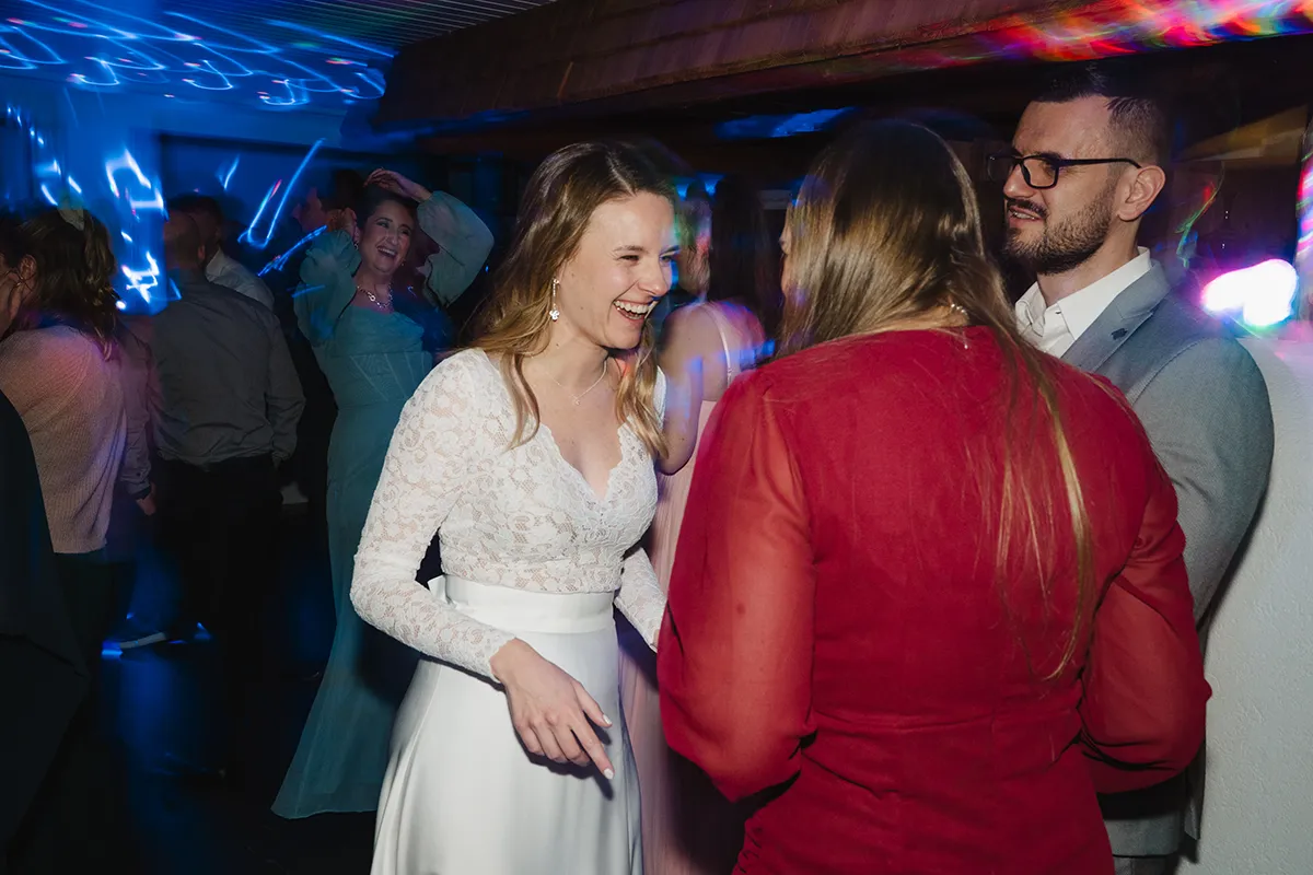 Bei den meisten Hochzeiten bin ich nach dem Tortenschneiden fertig. Hier durfte ich bis zum Schluss bleiben – und es hat so viel Spaß gemacht. Blitz auf die Kamera, rein in die Menge: Ich wurde zur Mitfeiernden, mitten im Geschehen, nicht nur Beobachterin.