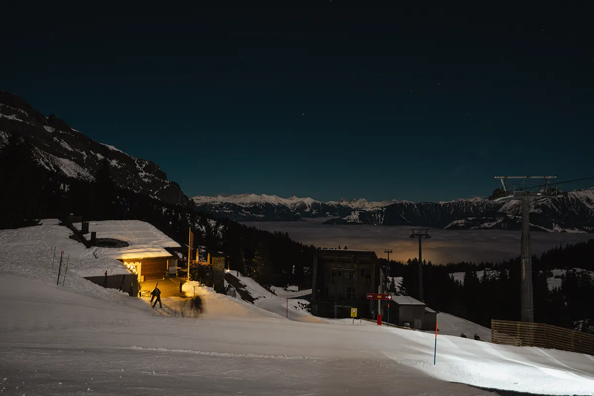 Um 1 Uhr morgens fuhren wir mit der letzten Gondelbahn ins Tal – mit Blick auf ein mystisches Nebelmeer. Was für ein Abend!