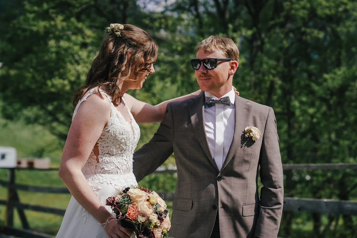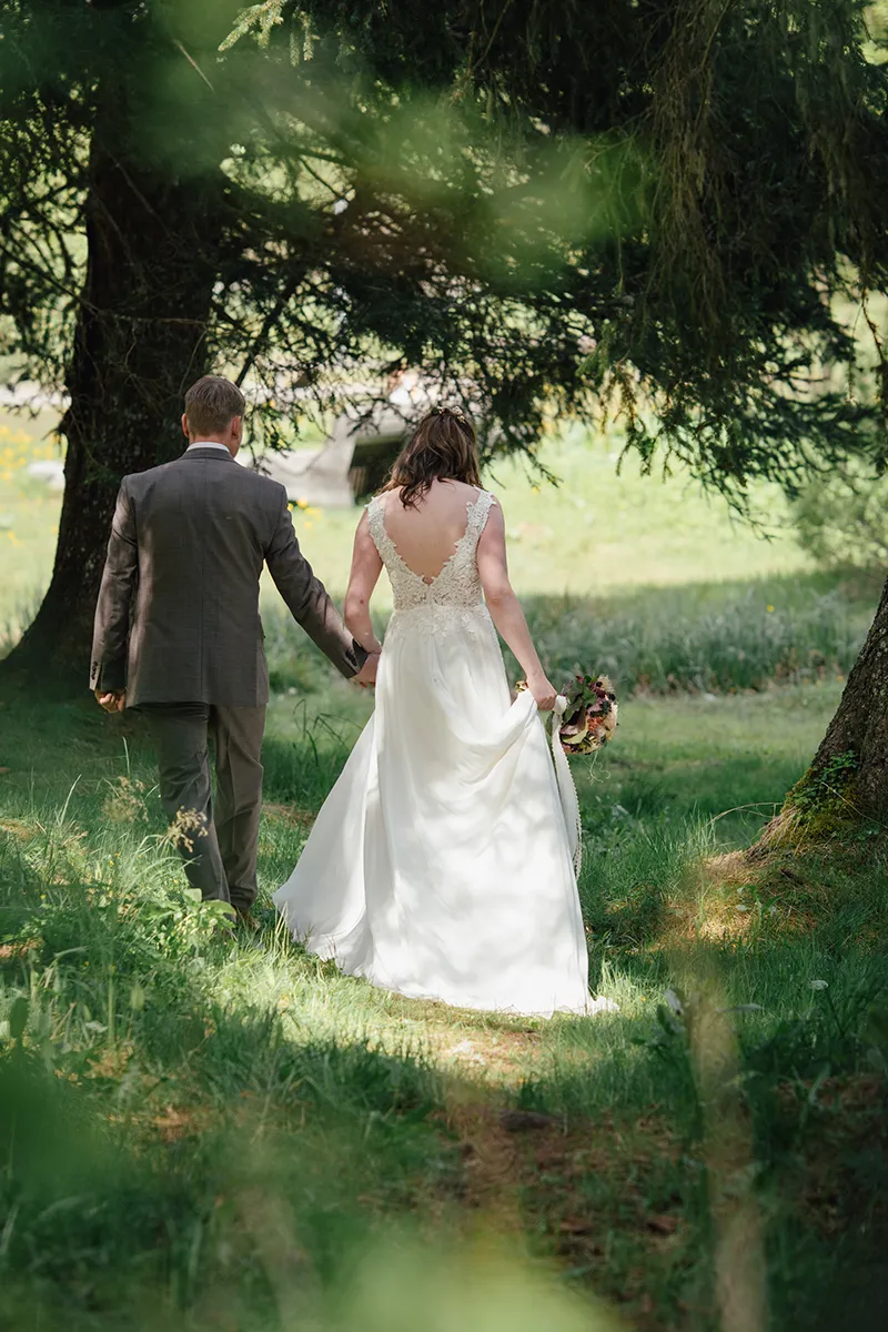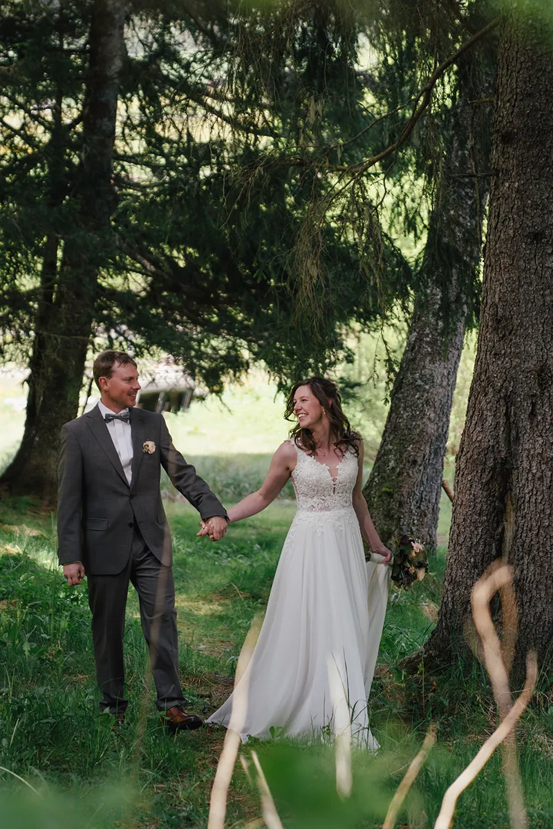 Die Stimmung war wunderschön: keine Menschen weit und breit, klare Luft, intensive Farben im Wald, das Bergpanorama mit den schneebedeckten Gipfeln im Hintergrund. Zum Schluss machten wir noch Fotos mit den Trauzeugen, danach ging es zurück zum Dorfplatz, wo bereits das Postauto und die Hochzeitsgesellschaft warteten.