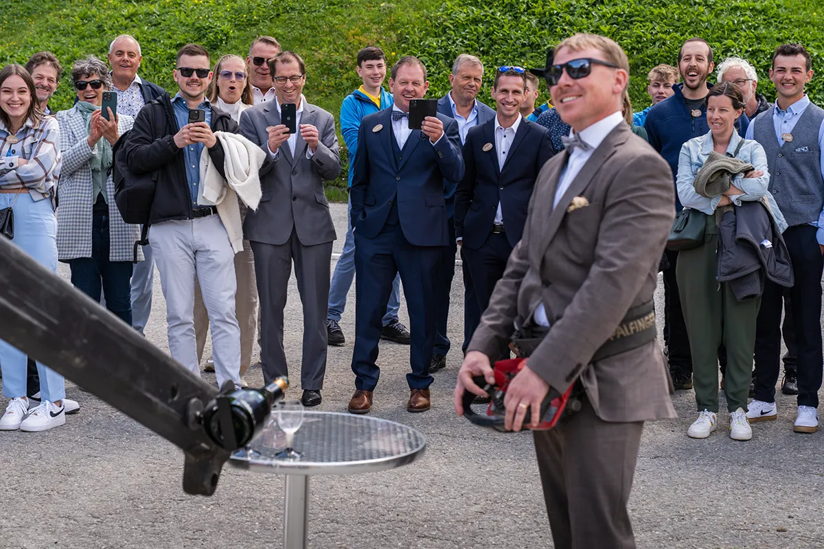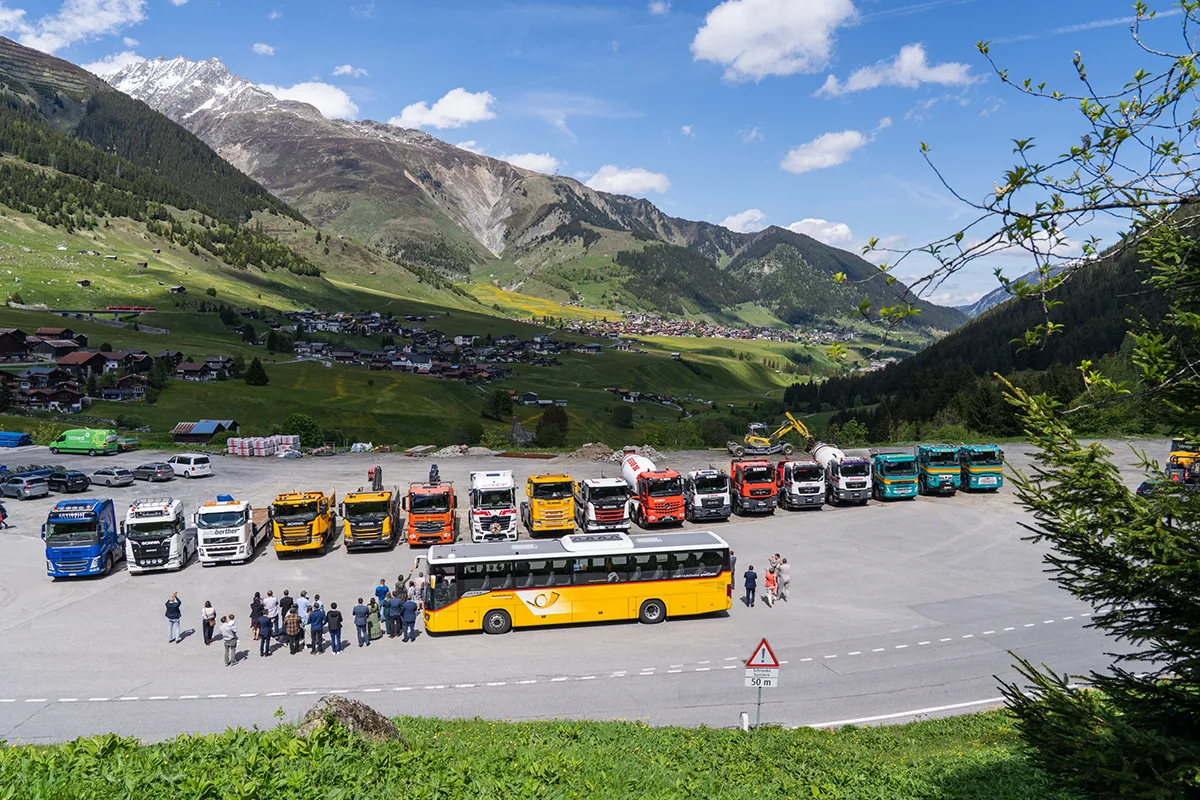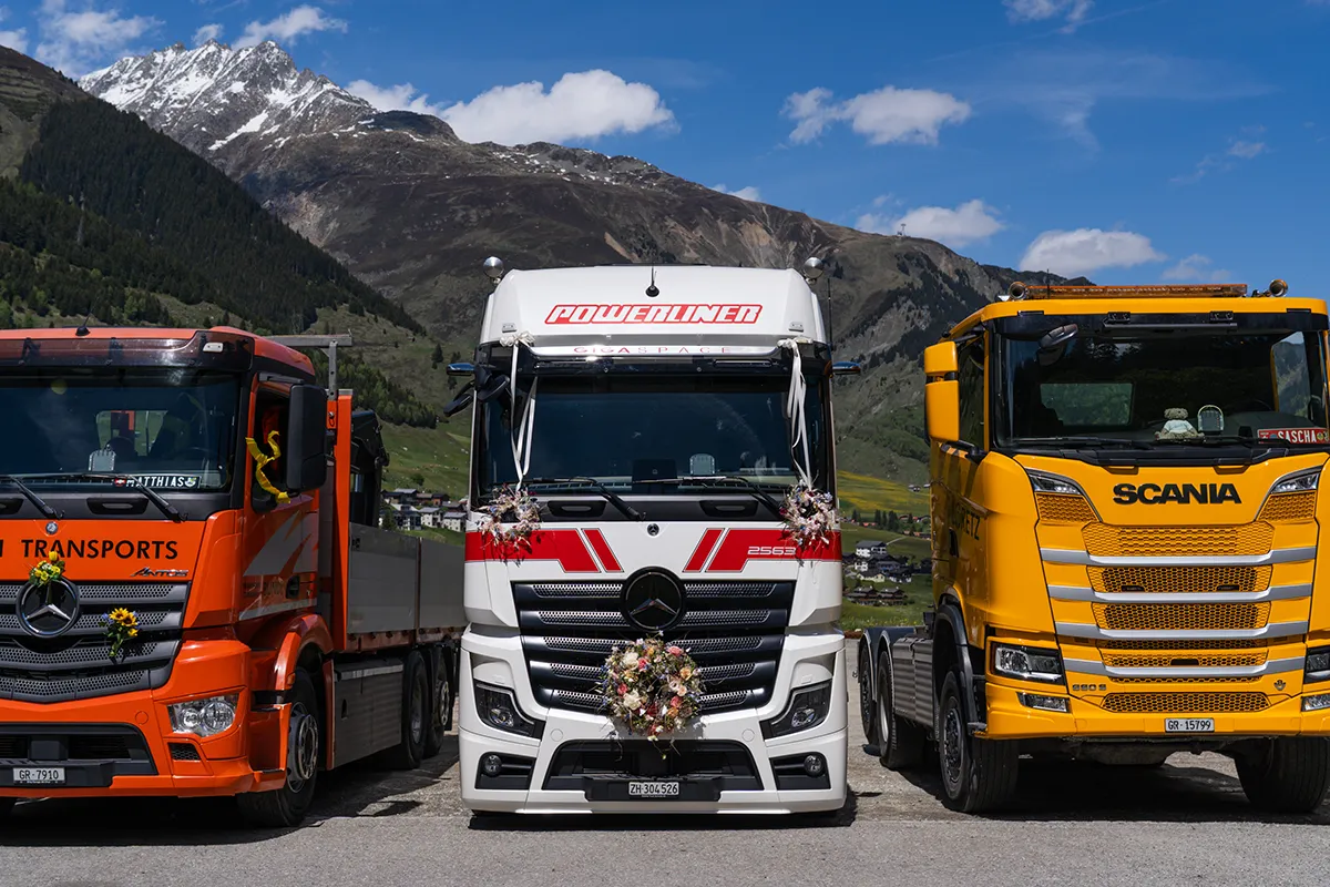 Mit dem Postauto ging es weiter nach Dieni, wo der grosse Apero in der Bar BigT stattfand. Als wir um die letzte Kurve fuhren und sich der Blick auf den Parkplatz öffnete, wartete eine riesige Überraschung: 17 Lastwagen standen aufgereiht und hupten, als das Postauto ankam. Es waren Arbeitskollegen des Bräutigams, die dem Paar dieses besondere Spalier schenkten.