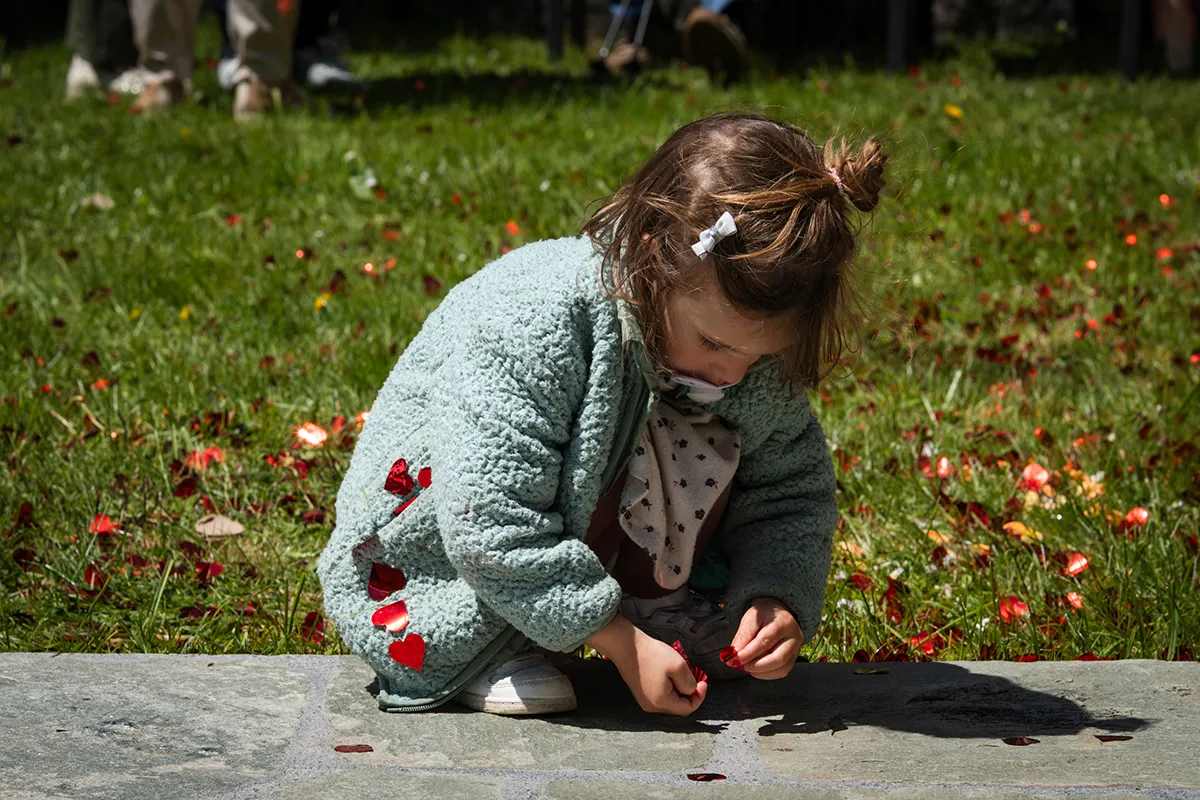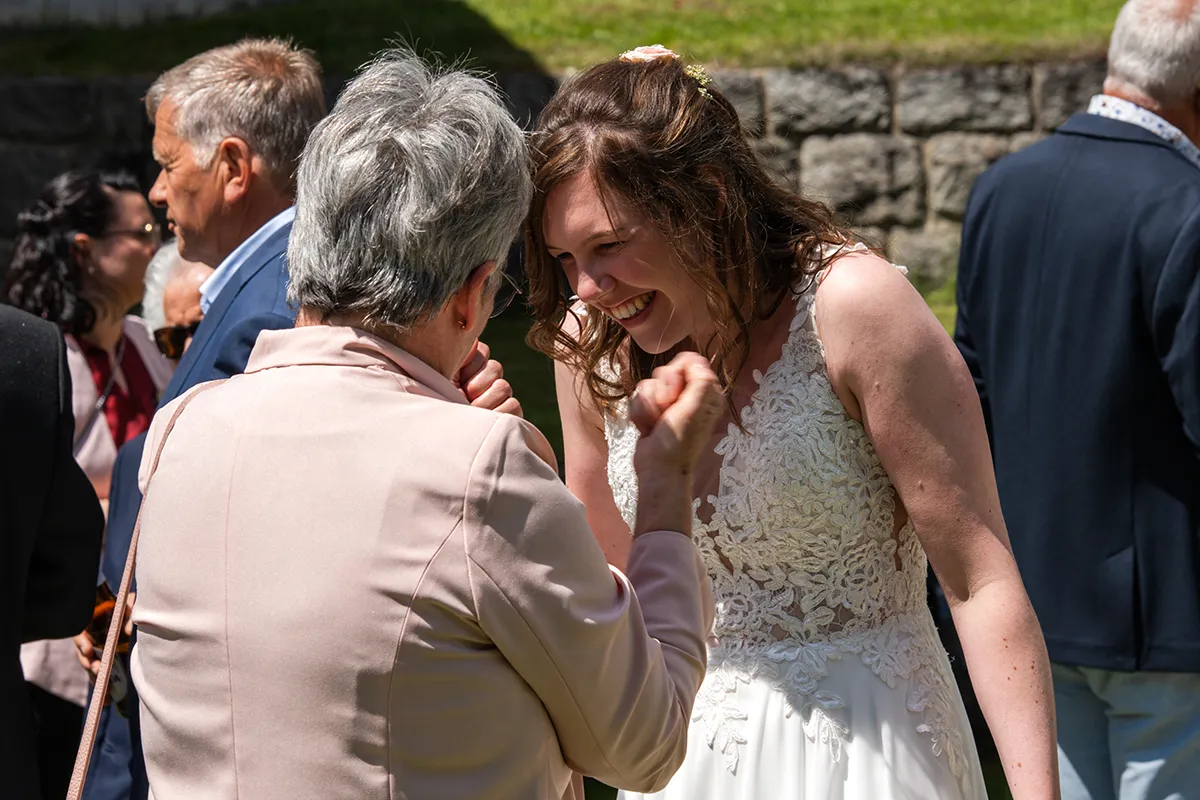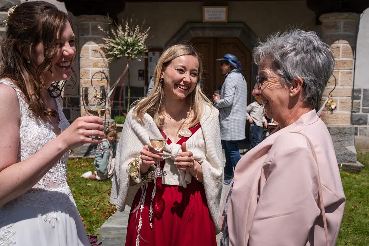 Nach der Trauung schritt das frischvermählte Paar durch das Spalier der Gäste und liess sich feiern. Im Hof der Kirche gab es ein Apero: Familie und Freunde gratulierten und genossen ein Glas Wein in der warmen Frühlingssonne.
