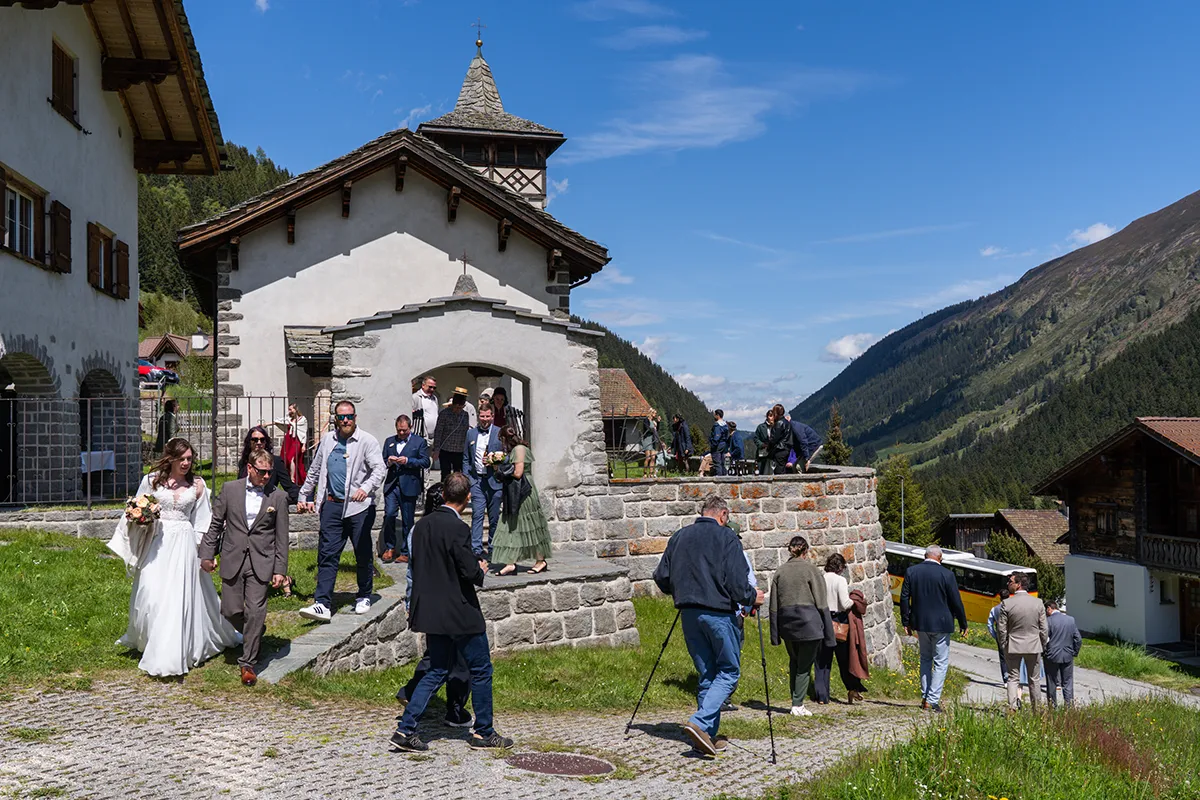 Als Hochzeitsfotografin in Graubünden habe ich schon viele Orte besucht, aber in Selva war ich bisher noch nie. Diese kleine Bergkirche kommt definitiv auf meine Liste der schönsten Hochzeitslocations in Graubünden. Selva ist eine Fraktion der Gemeinde Tujetsch und zählt gerade einmal 11 Einwohner. Ein schmales Strässchen führt zur Kirche hoch, und der Blick talabwärts ist eindrücklich.