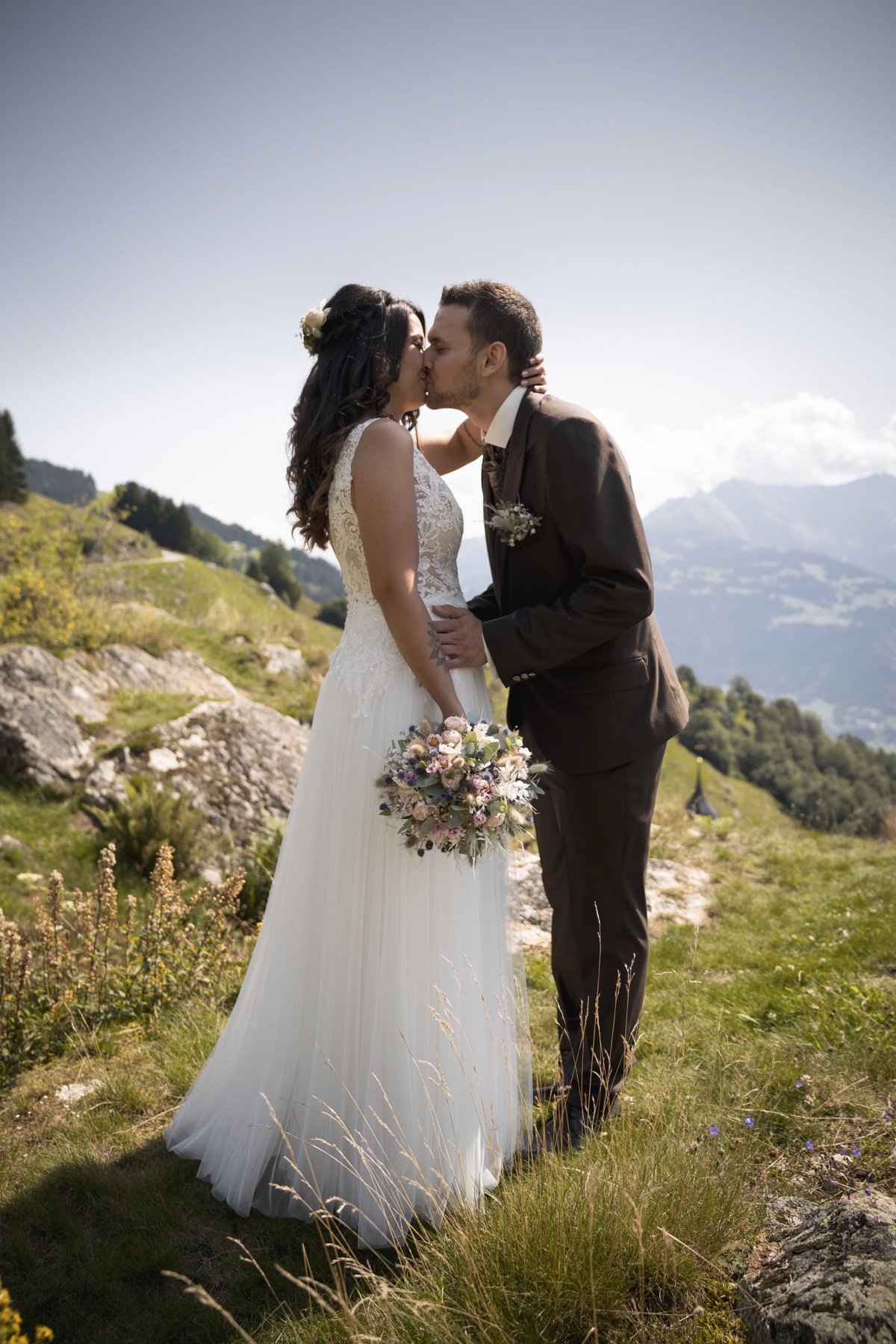 Es war ein Tag wie aus einem Märchenbuch: strahlende Sonne, blauer Himmel, Bergwiesen im satten Grün (dank des regnerischen Sommers) und klare Luft mit weiter Sicht über das Bergpanorama. Ein perfekter Tag für eine Hochzeitsreportage in Graubünden.