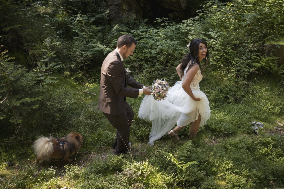 Das Brautpaarshooting machten wir direkt anschliessend im Wald oberhalb von Siat – einem magischen Ort, der wie aus einem Märchen wirkt. Der moosbedeckte Waldboden, die hohen Tannen, das Licht, das durch die Äste fällt und wunderschöne Lichtspiele erzeugt – dieser Wald hat eine besondere Atmosphäre.