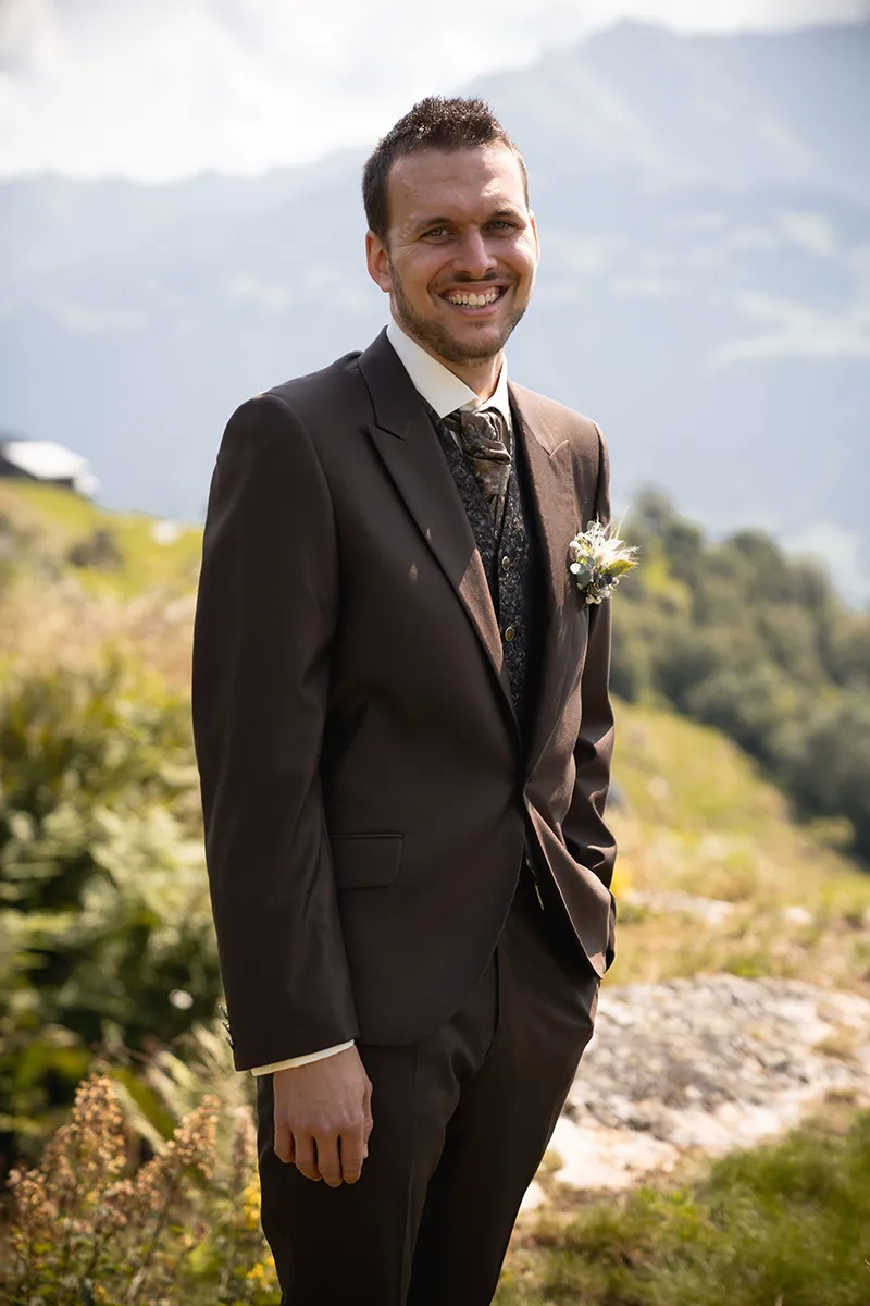 Der First Look fand oberhalb von Siat statt, auf einem Felsen mit fantastischer Aussicht. Dort wartete ich mit dem Bräutigam, als die Braut langsam die Stufen hinaufkam und zu ihrem Liebsten ging. Ein emotionaler Moment mit beeindruckender Alpenkulisse.