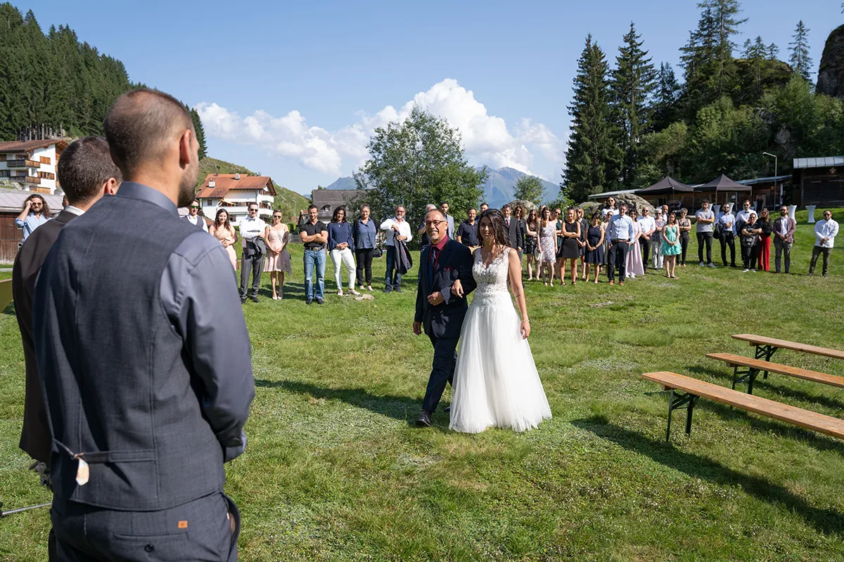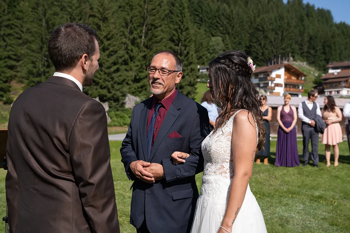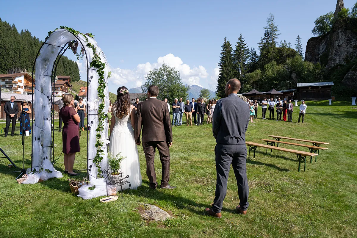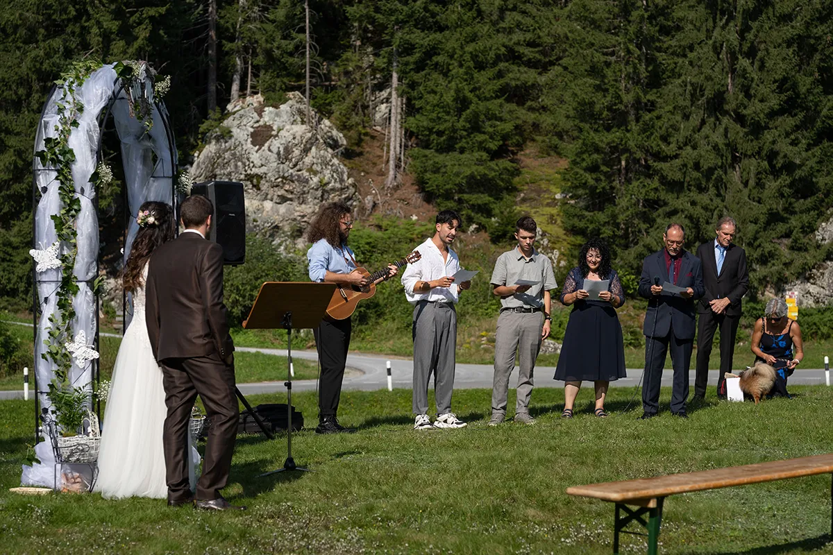 Für mich war der schönste Teil dieser Hochzeit die freie Trauung auf einer offenen Bergwiese oberhalb von Siat. Der Blumenbogen, unter dem das Brautpaar stand, die musikalische Begleitung durch den Bruder der Braut und die emotionalen Beiträge der Eltern und Geschwister – es war eine Berghochzeit in Graubünden, wie man sie sich nur wünschen kann.