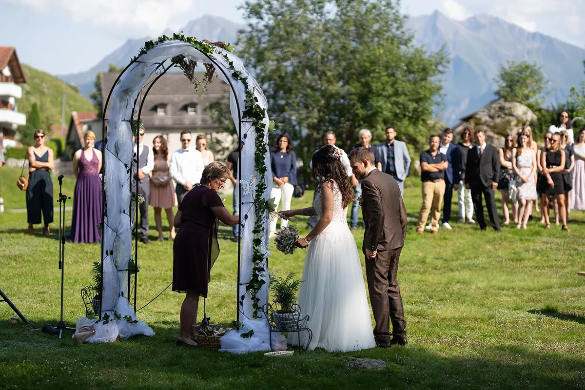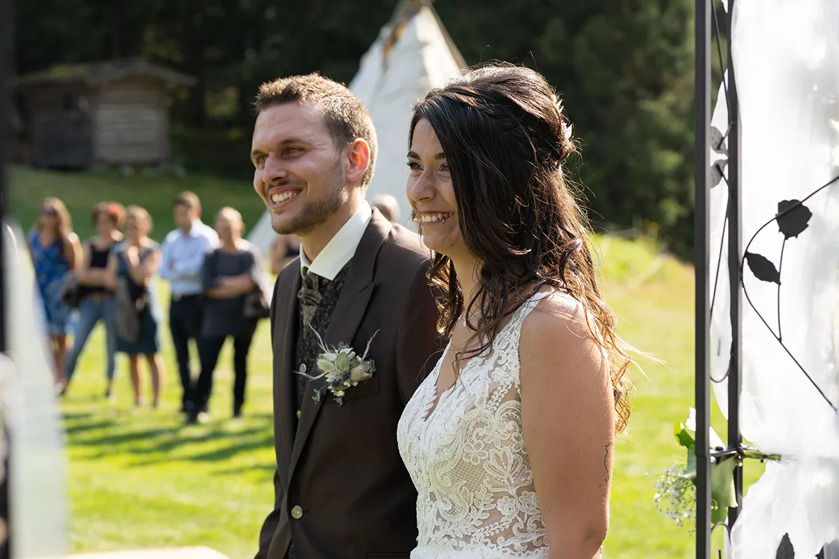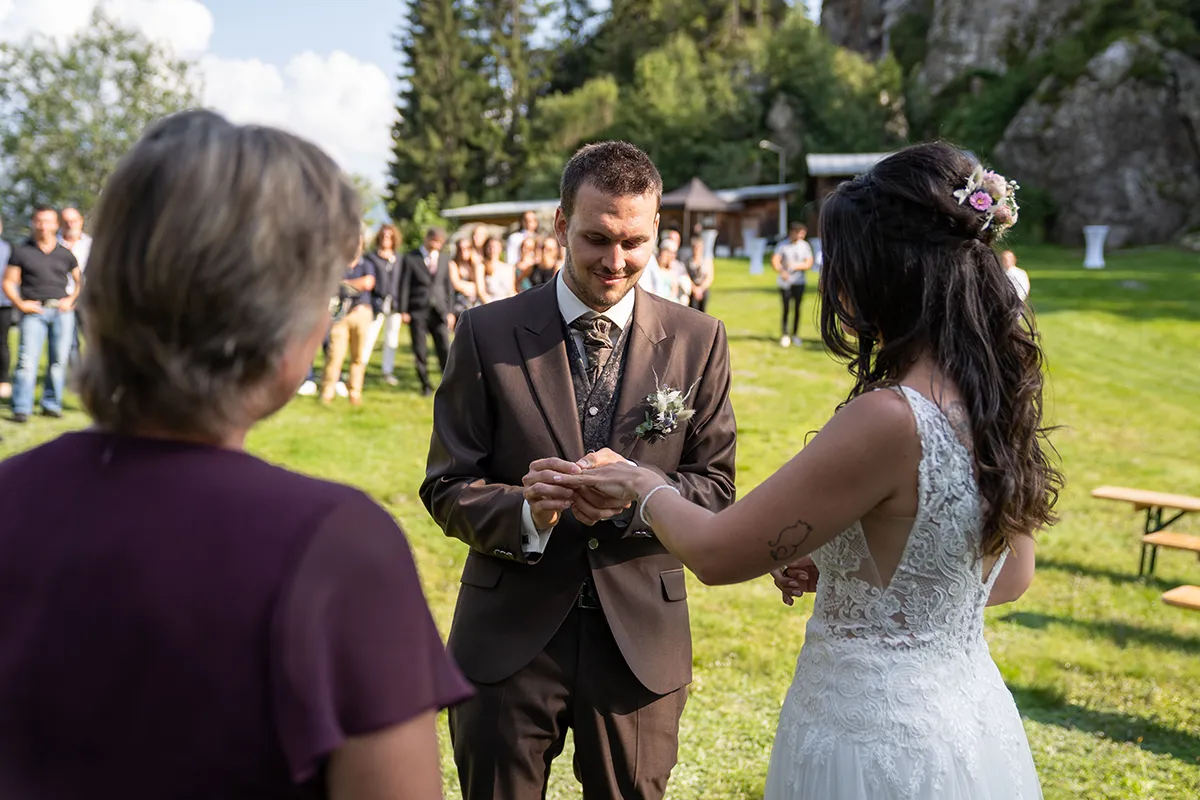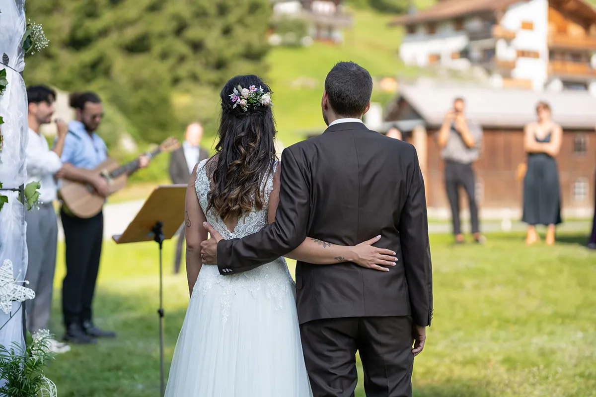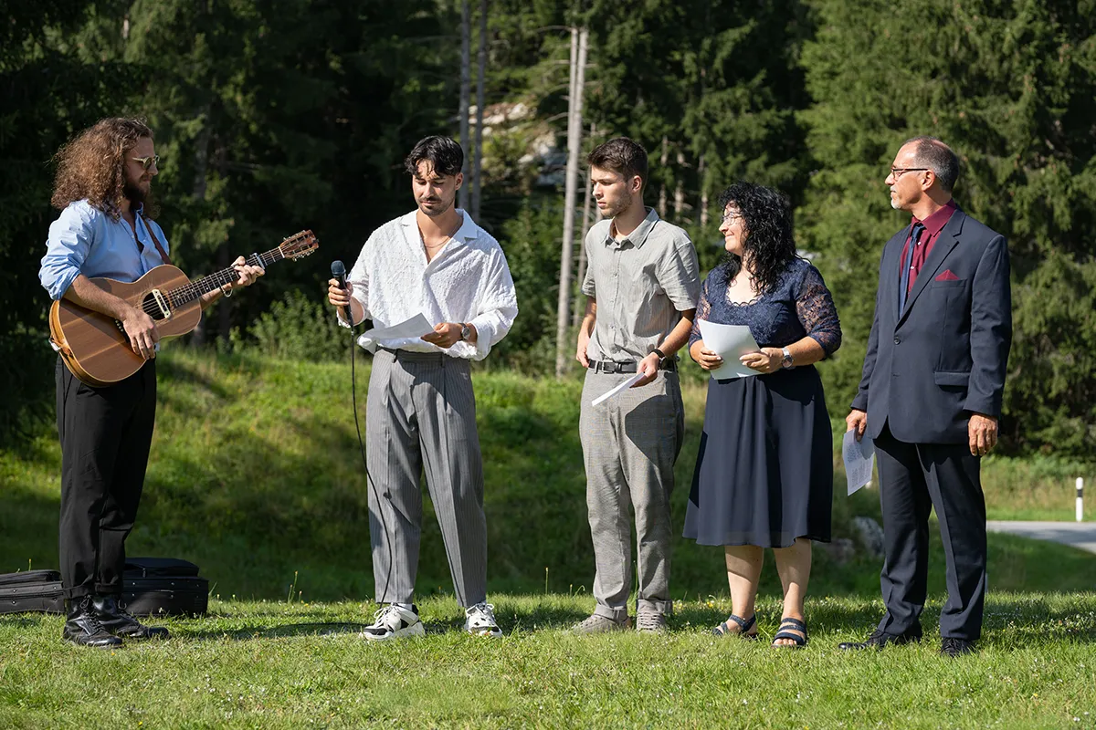 Für mich war der schönste Teil dieser Hochzeit die freie Trauung auf einer offenen Bergwiese oberhalb von Siat. Der Blumenbogen, unter dem das Brautpaar stand, die musikalische Begleitung durch den Bruder der Braut und die emotionalen Beiträge der Eltern und Geschwister – es war eine Berghochzeit in Graubünden, wie man sie sich nur wünschen kann.