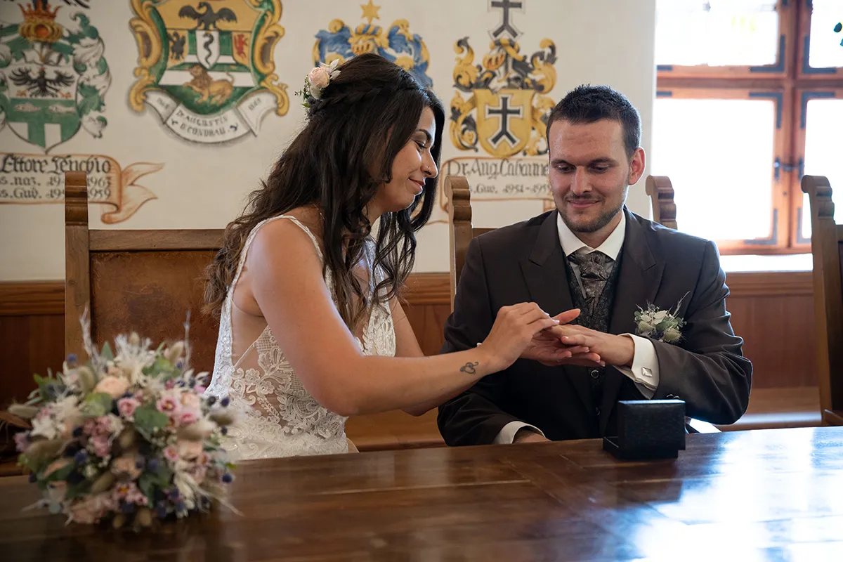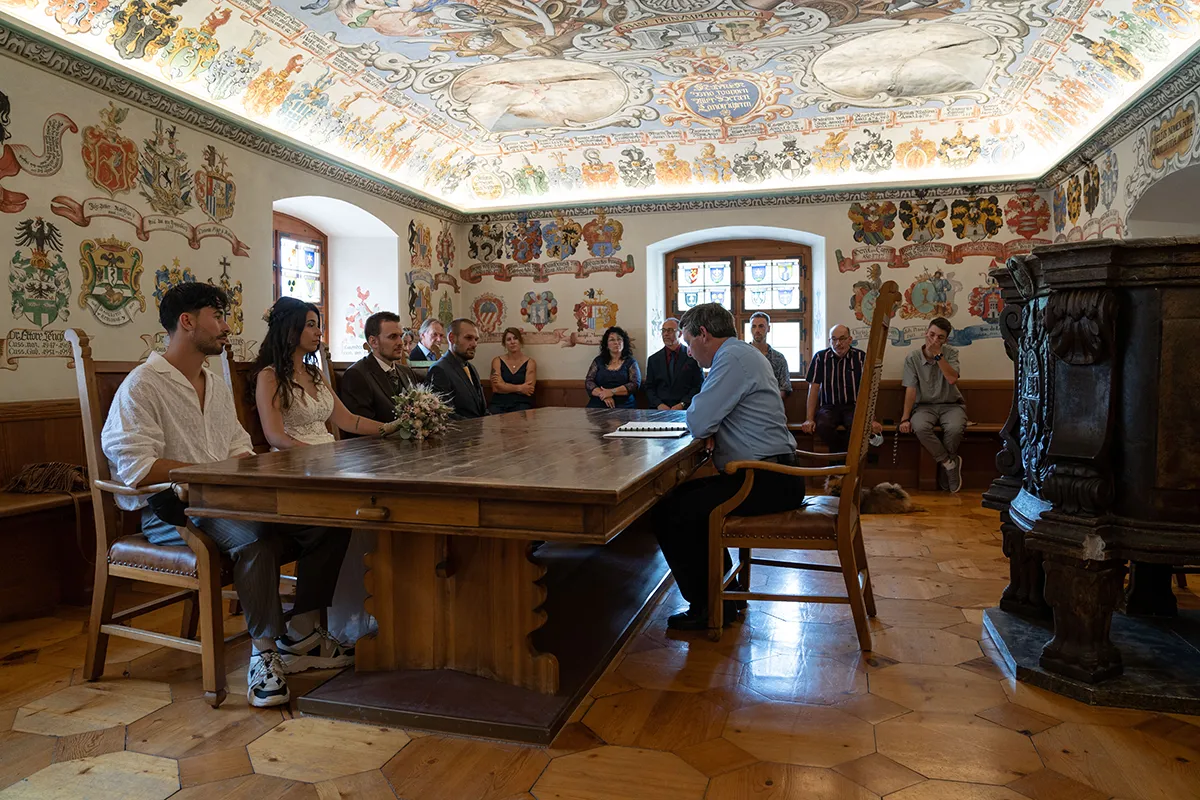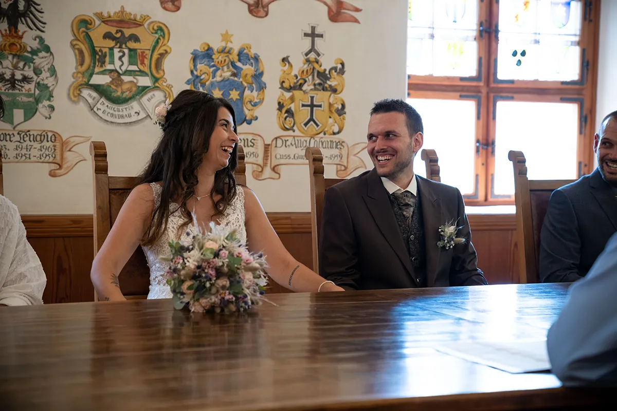 Die standesamtliche Trauung fand im historischen Wappensaal der Cuort Ligia Grischa statt – ein wunderschöner Raum mit viel Geschichte. Anschliessend gab es ein kleines Apero im Hofgarten, bevor es zurück nach Siat ging.