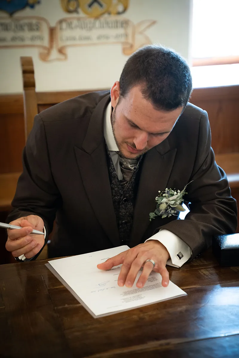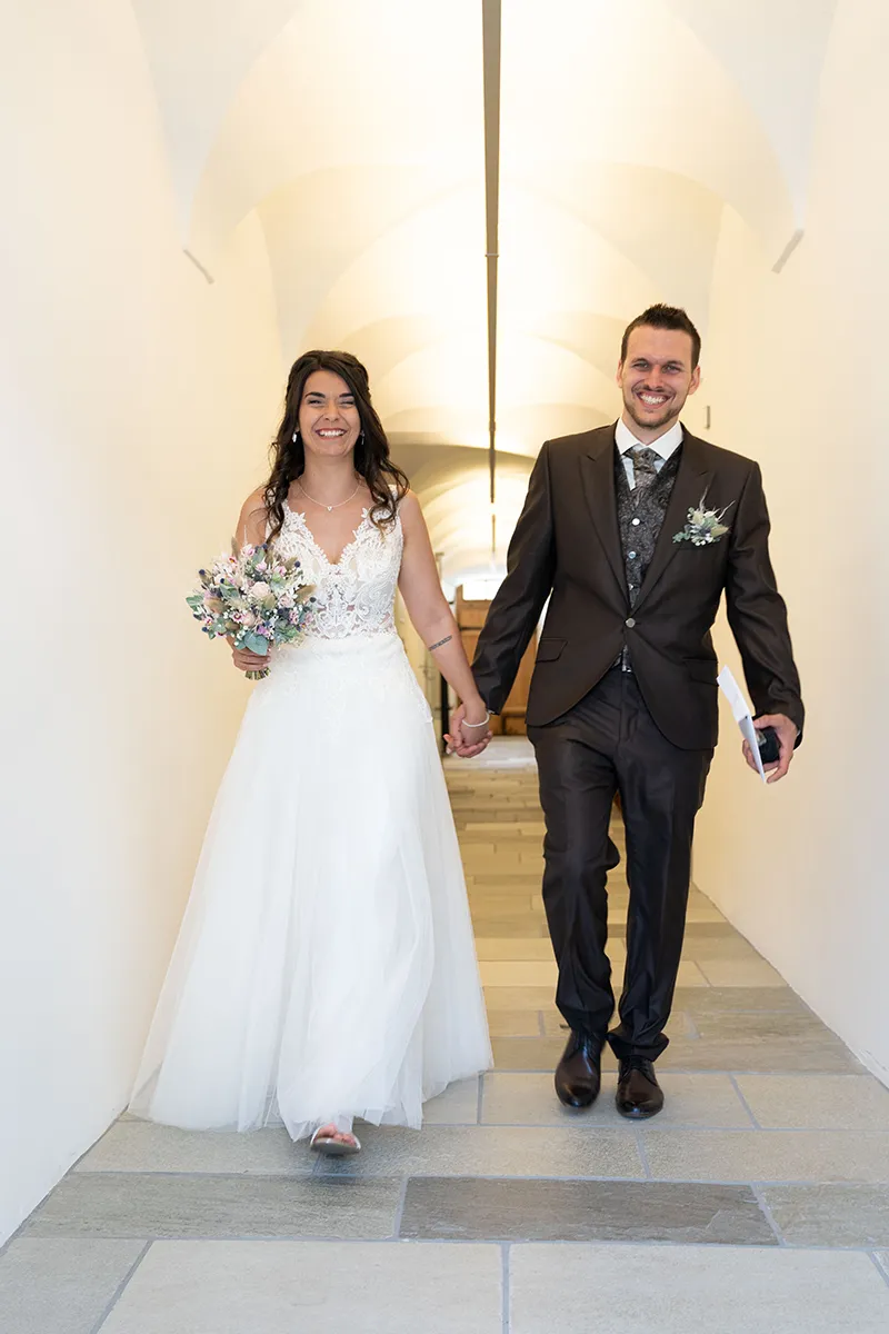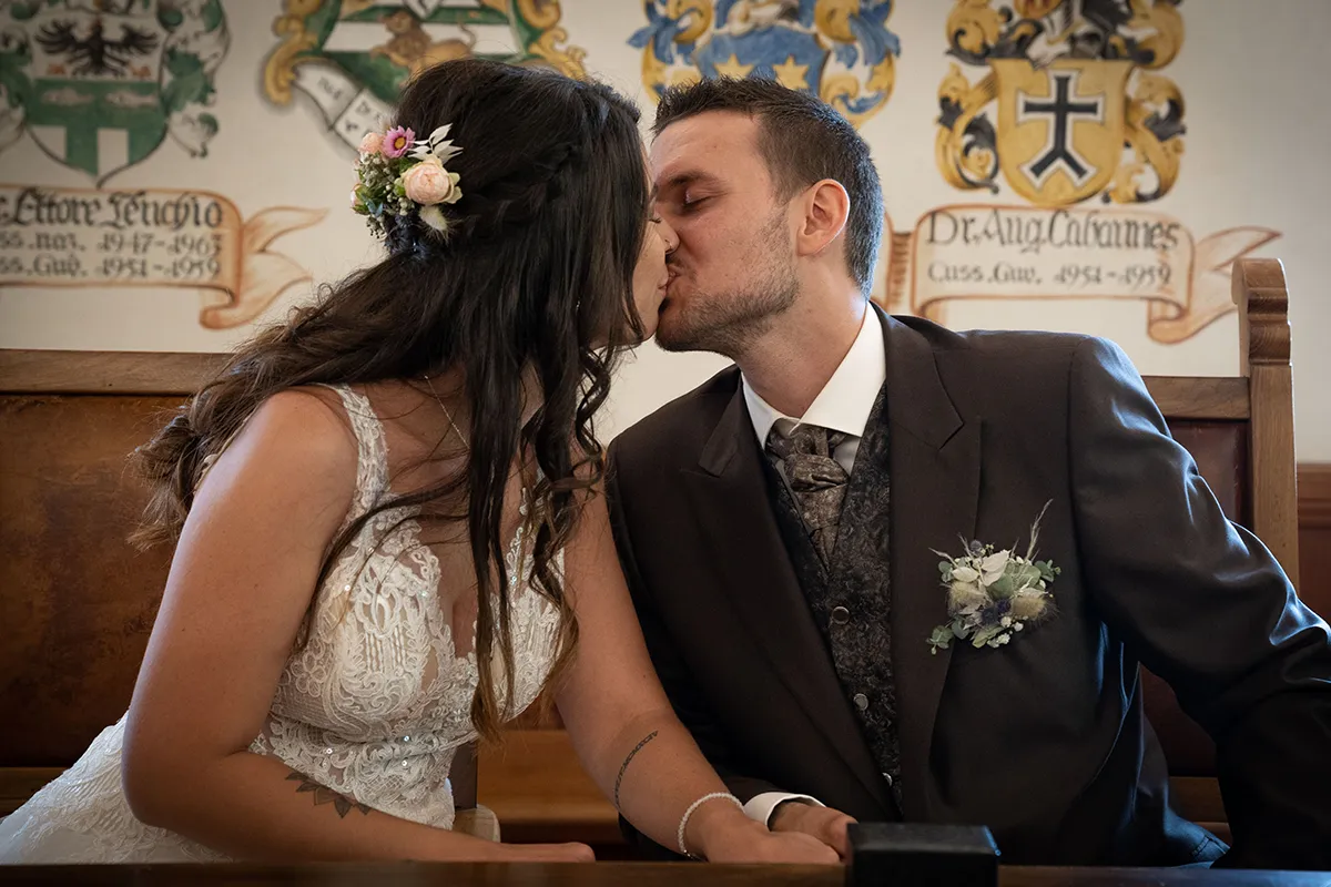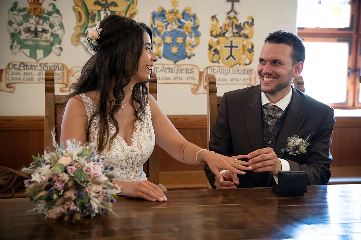 Die standesamtliche Trauung fand im historischen Wappensaal der Cuort Ligia Grischa statt – ein wunderschöner Raum mit viel Geschichte. Anschliessend gab es ein kleines Apero im Hofgarten, bevor es zurück nach Siat ging.